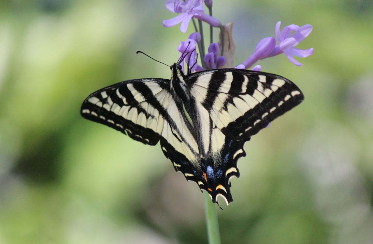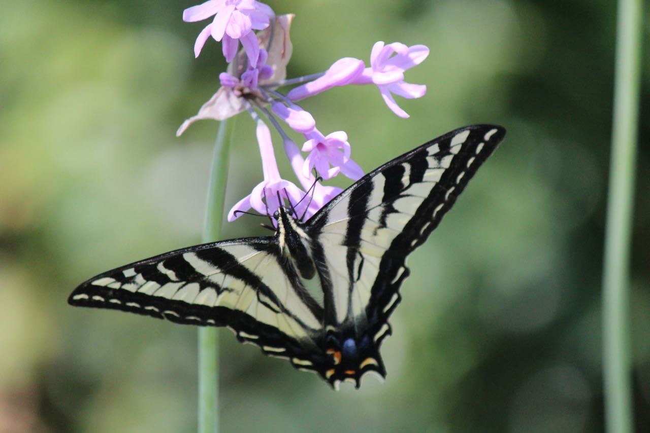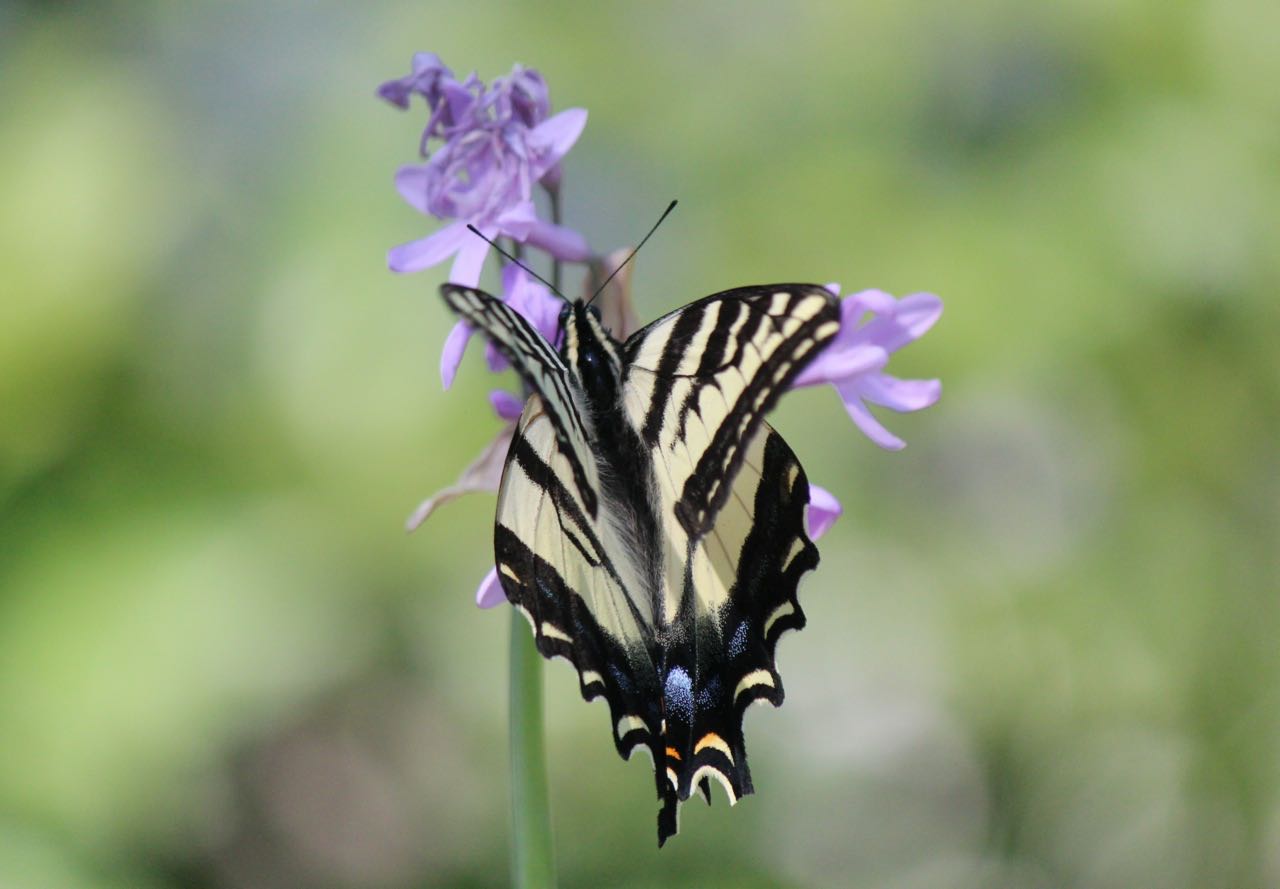 These four photographs of Western tiger swallowtail butterflies were taken in a period of a few seconds. The butterfly was enjoying the flower, fluttered its wings, and flew away. I especially like the third photo because it almost looks like there are two butterflies. I looked out my kitchen window and saw the butterfly on the flower, ran and got my camera, took a quick few photos, and the butterfly was gone. It was a special treat. MK |