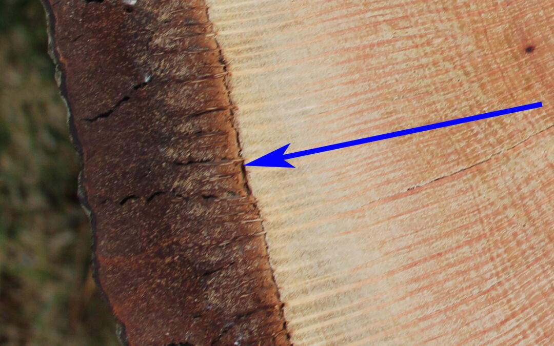 Cambium: Where all secondary growth happens in a tree. Phloem cells, or bark, are produced to the outside of the cambium layer and Xylem cells, or sapwood, are produced to the inside. This secondary growth causes a tree to increase in girth.