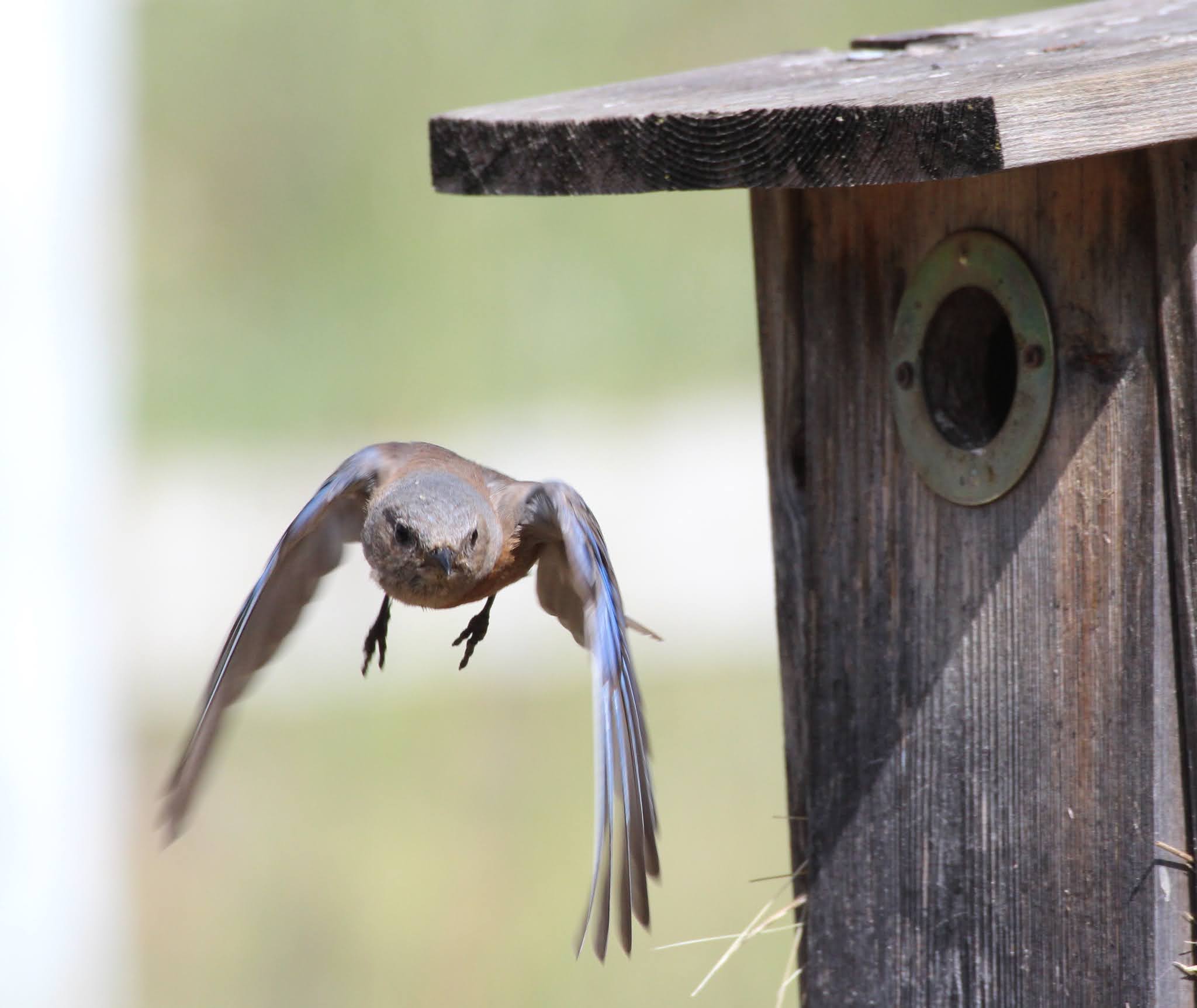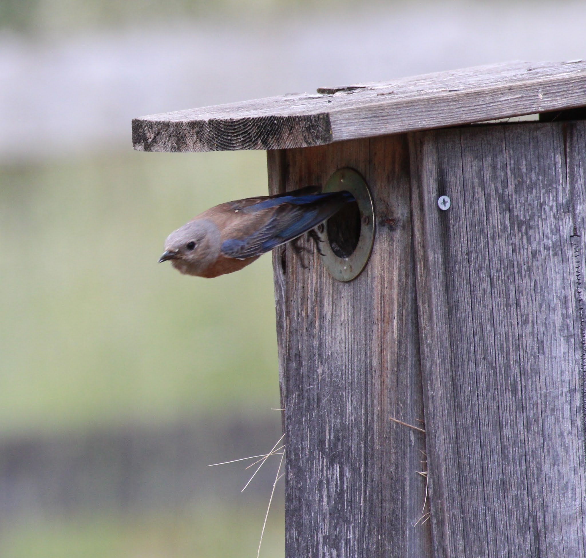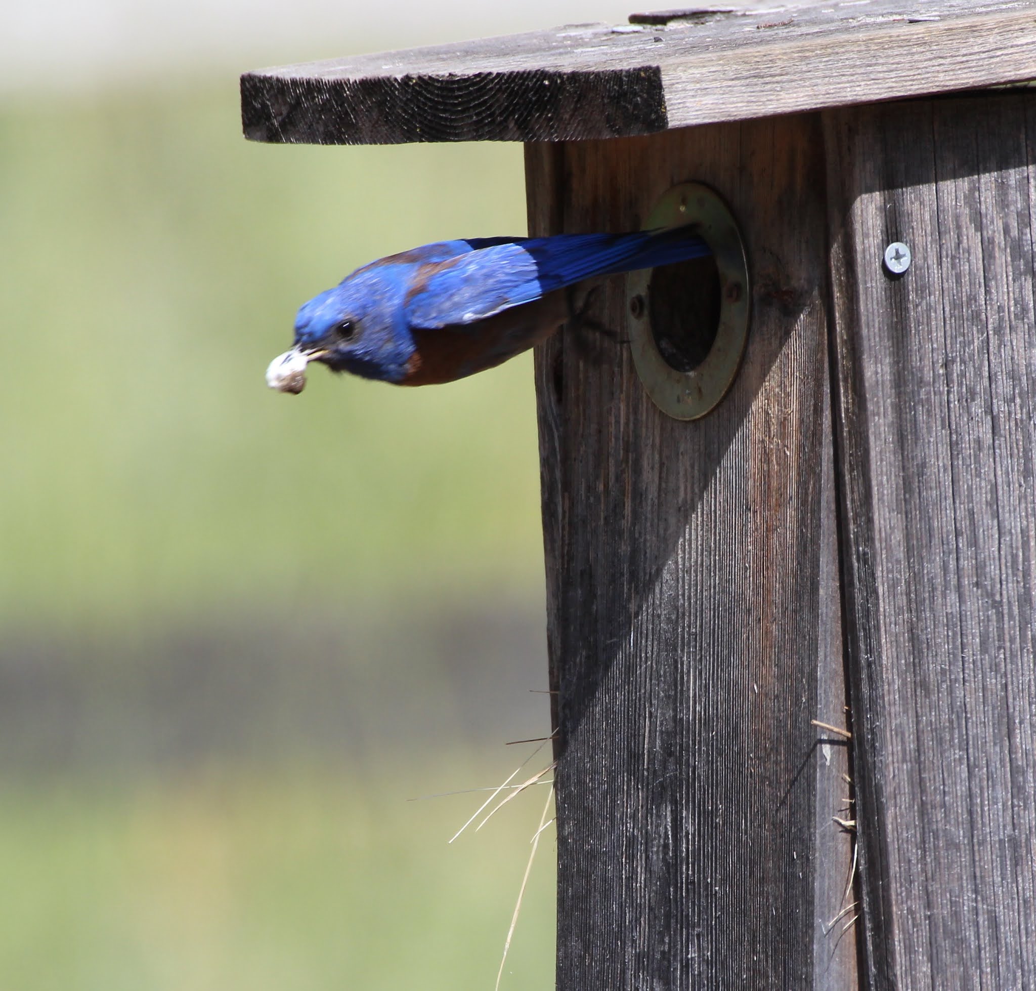 Male Western bluebird returning to the nest box with a meal for the chicks. |